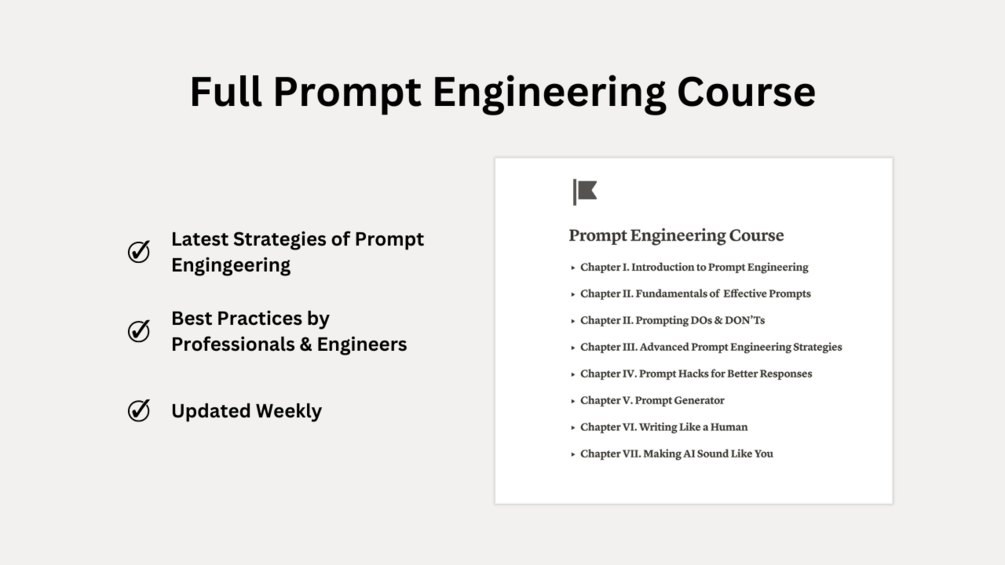 - Prompt Engineering Course: Exclusive access to a comprehensive course on prompt engineering, complete with best practices, case studies, and advanced techniques.